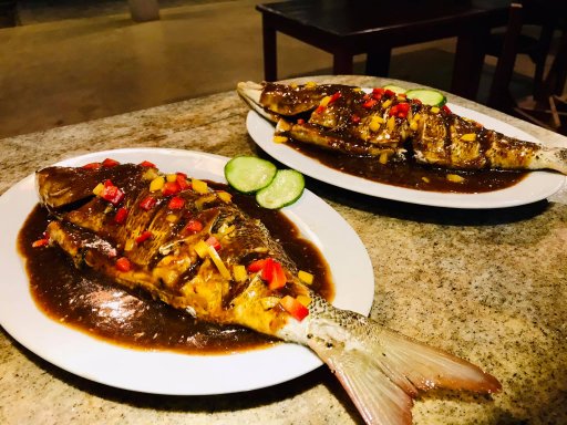 Whole steamed fish sprinkled with diced vegetables and rich gravy.
