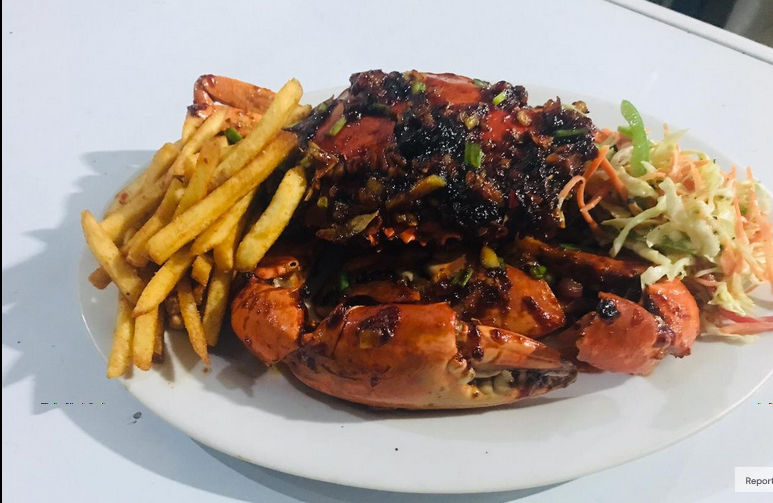 Chilli crab with a rich cranberry sauce topping, served with French fries.