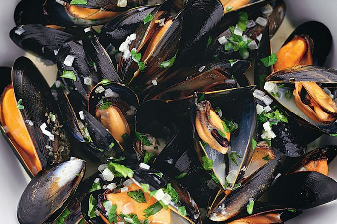 Mussels in white wine, butter and garlic, cooked the French way (moules mariniere).