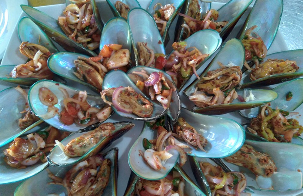 Cleaned and fresh mussels, tenderly cooked and re-shelled, with onion.