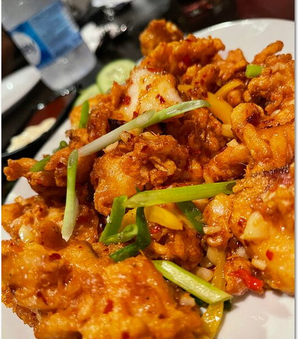 Battered oysters and calamari. A crunchy favourite mouth-watering duo of seafood garnished with spring onions.