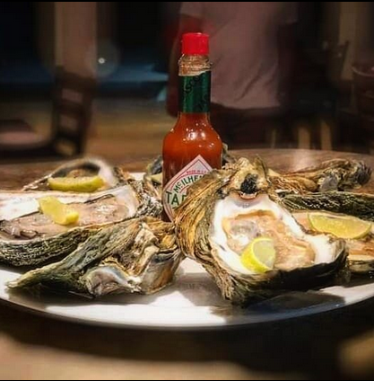 Oysters and calamari, a great combination with optional tobasco sauce.